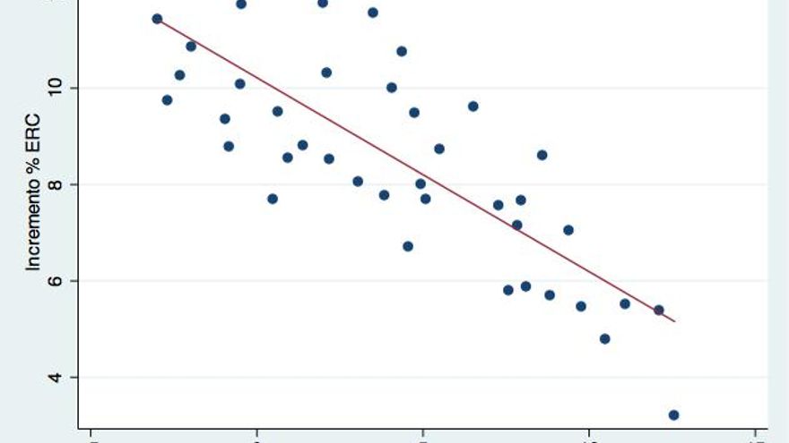 Con las cautelas debidas, un análisis algo más detallado de los resultados electorales en las 41 comarcas catalanas también parece indicar que el problema principal de CiU no ha sido que sus votantes hayan migrado a ERC. El primer gráfico muestra que en las comarcas donde CiU ha perdido más votos es precisamente donde el apoyo electoral a ERC aumenta menos. Es decir, caídas de CiU no equivalen a subidas de ERC. Esto nos haría pensar que el trasvase, de existir, no ha sido tan grande.
