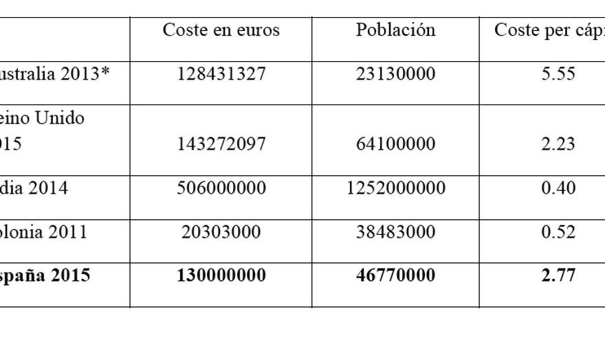 Así las cosas, lo mejor es desagregar la información para que cada uno se forme su opinión con los datos disponibles. Lo hago de dos modos. La primera es teniendo en cuenta el coste de la organización de la elección como comentaba antes. Como muestra la tabla 1, parece que España tiene costes similares a los del Reino Unido e inferiores a los de Australia. Los costes, sin embargo, parecen estar muy por encima de Polonia o la India (pero que los indios no incluyen los costes de seguridad).