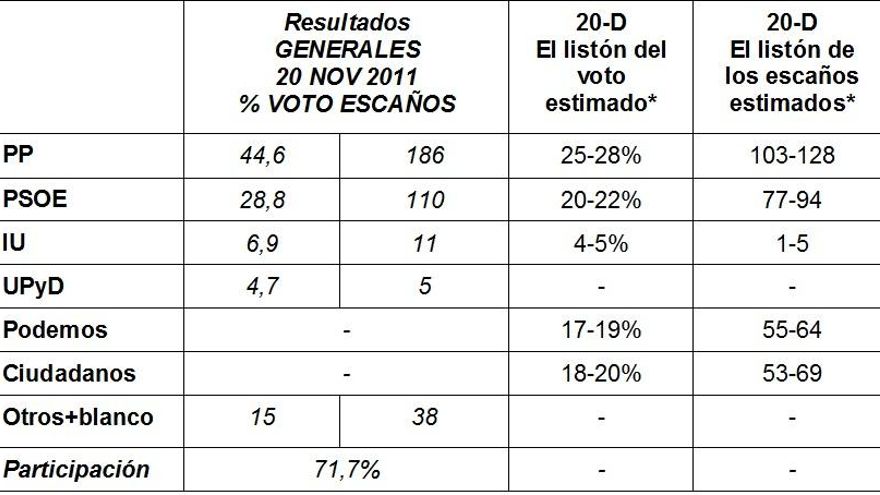 *Se han tenido en cuenta los sondeos de El País (14/12/2015), El Mundo (14/12/2015), El Periódico (14/12/2015) y La Cadena Ser (14/12/2015). La encuesta preelectoral del CIS, realizada antes de la campaña electoral, recoge la siguiente estimación: PP (28,6% del voto/120-128 escaños), PSOE (20,8% del voto/77-89 escaños), Ciudadanos (19% del voto/63-66 escaños), Podemos sin contar con la candidaturas con las que presenta conjuntamente (9,1% del voto/23-25 escaños) e IU (3,6% del voto/ 3-4 escaños).