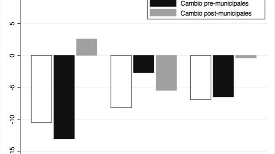 Si comparamos con las elecciones generales de 2011 (primera columna del gráfico), es cierto que la caída del PSOE es ligeramente mayor en los municipios gobernados por las confluencias, aunque la diferencia no es significativa. Pero si nos fijamos en la segunda y tercera columna, que reflejan, respectivamente, la caída producida antes y después de las elecciones de Mayo, lo que se aprecia es que la caída del PSOE en el primer grupo de ciudades se produjo antes de la llegada de las nuevas candidaturas municipalistas a las alcaldías. De hecho, de Mayo a Noviembre el PSOE sólo crece en porcentaje de voto en el grupo de ciudades gobernadas por los aliados de Podemos, mientras que pierde más de cinco puntos respecto a los resultados obtenidos en Mayo en los municipios que gobierna, y mantiene constante el porcentaje de votos en el resto.