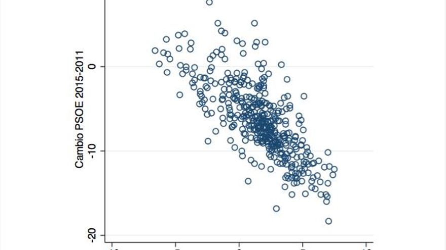 Cambio en el voto al PSOE 2011-2015 y voto a Podemos y Ciudadanos el 20D.