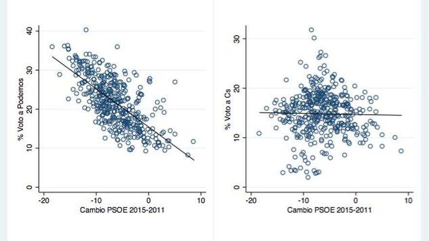 Otra forma indirecta de ver hacia dónde van los antiguos votantes socialistas es analizar las correlaciones, de nuevo a nivel municipal, entre pérdidas del PSOE y ganancias de Podemos y Ciudadanos. Aunque no debemos dejar de perder de vista el posible problema de inferencia ecológica (correlaciones a nivel agregado no necesariamente implican correlaciones a nivel individual), los gráficos son ilustrativos: las pérdidas del PSOE están muy fuertemente asociadas a porcentajes altos de voto para Podemos, y nada relacionados con el voto a Ciudadanos. Podría ser que los lugares donde hay transferencias de socialistas hacia Ciudadanos son lugares donde a la vez Ciudadanos logra atraer menos votantes de otras partes del espectro político (eso explicaría la ausencia de correlación en el gráfico), pero esta posibilidad parece bastante rocambolesca. Lo más probable es, sencillamente, que las transferencias de PSOE hacia Ciudadanos hayan sido en realidad muy limitadas.