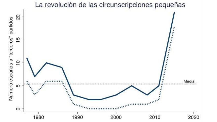 Nota: el gráfico muestra el número de escaños que obtienen las terceras o cuartas fuerzas políticas en las circunscripciones de magnitud igual o inferior a 5.