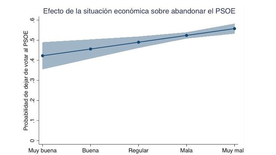 Nota: el gráfico muestra probabilidades predichas de dejar de votar al PSOE (vs seguir votándolo) en un modelo de regresión logístico en las que se incluyen como variables explicativas: situación económica, gestión del gobierno, valoración de líderes, edad, sexo, situación laboral