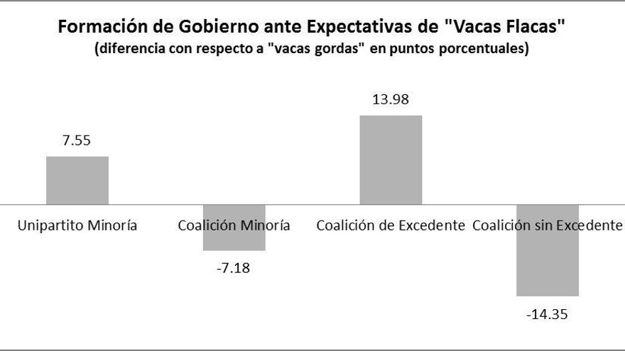 Estos datos deben tomarse con prudencia: obviamente, en el momento de formar gobierno los partidos no saben exactamente cómo acabará la legislatura en términos económicos. Pero en cualquier caso, parece que cuando los partidos candidatos a formarlo prevén tener que dar malas noticias cuando lleguen nuevas elecciones, se forman menos coaliciones de las habituales, más gobiernos unipartito minoritarios y, puestos a compartir la patata caliente, más coaliciones de excedente tipo gobiernos de concentración nacional (con más partidos de lo que sería necesario aritméticamente).