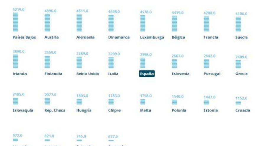 En otros aspectos que también están muy directamente relacionados con la intervención pública, como la educación, no estamos tan bien como los ciudadanos de Londres o Gotemburgo. Y en otros más indirectamente relacionados, como el empleo, estamos claramente peor. Que tenemos que mejorar nuestro sistema educativo y nuestras políticas activas de empleo es bien conocido. Lo que quizás no lo es tanto es que, en otros pilares esenciales de la actividad pública, como seguridad o sanidad, obtenemos unos resultados espectacularmente buenos en términos comparados. Tenemos, pues, por tanto que aprender, pero también otros tienen que aprender de lo que hemos conseguido en algunos ámbitos. No sólo en términos de eficacia, pero también de eficiencia. Pues en algunas cosas hemos gastado relativamente poco en comparación con otros países. Por ejemplo, aquí vemos cómo el gasto sanitario total por habitante está en la media de la Unión Europea, por encima de casi todos los países del Este, pero por debajo de casi toda la Europa occidental. No gastamos, pues, mucho.