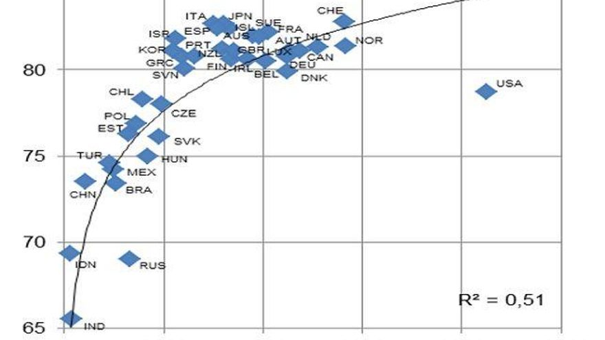 Y, sin embargo, no parece que lo estemos haciendo muy mal. Como podemos ver aquí, somos uno de los países del mundo, como Italia o Japón, donde más partido parece que le estamos sacando a la inversión en sanidad. Dicho en términos un poco toscos, nuestra esperanza de vida es muy alta para lo que gastamos en sanidad. De nuevo, atribuir la esperanza de vida a la calidad de la sanidad es poco prudente. Pero, si lo sumamos a otros aspectos, como la relativa satisfacción de los españoles con su sistema sanitaria, podemos concluir que, como mínimo, el sistema sanitario parece que funciona relativamente bien.