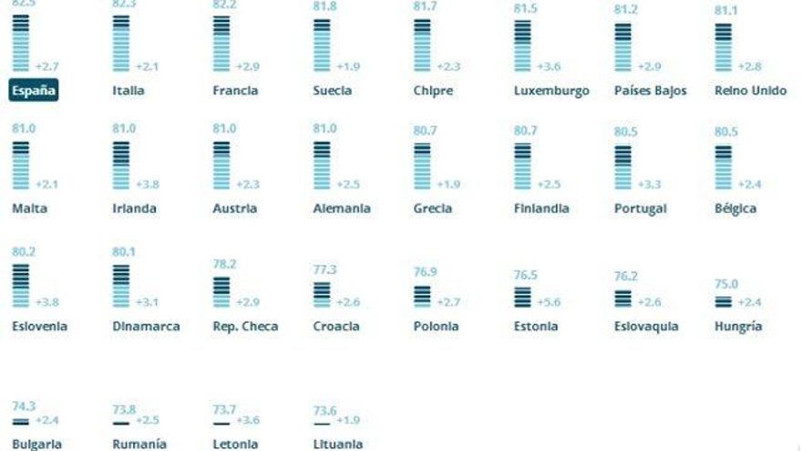 Un vistazo rápido revela algunas sorpresas. En la actividad fundamental de todo estado, que es evitar que la vida sea corta y brutal, utilizando los términos de Hobbes, las regiones españolas no parecen estar haciéndolo mal. Los españoles se sienten más seguros y más satisfechos con su salud que sus correligionarios londinenses o suecos. Esta percepción queda confirmada por datos tan objetivos como la esperanza de vida al nacer. Aquí vemos cómo somos los europeos con mayor esperanza de vida: