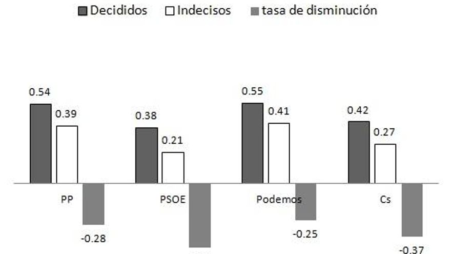 El segundo gráfico mira la otra cara de la moneda de la pregunta del CIS, es decir, muestra el porcentaje de decididos e indecisos que indican que con 70% de probabilidad o más votarían a cada uno de los partidos. El porcentaje para los decididos no se aleja mucho de las predicciones que van arrojando las encuestas estos últimos meses. Y entre los indecisos no existe ninguna diferencia destacable. Cada uno de los cuatro partidos analizados recoge en torno a un 10% de encuestados con una alta probabilidad de darle su voto. Haciendo un símil con la ya famosa frase “no hay mejor defensa que una buena defensa”, podríamos decir que no hay mejor caracterización de un indeciso que a través de su indecisión. Pero digámoslo de otra manera: a pesar de que se puede interpretar que el PSOE y Ciudadanos tienen una ventaja potencial entre los indecisos -por ser los que menos recelos despiertan- de momento no la capitalizan. Y los indecisos, incluso en una escala de grises, permanecen indecisos.