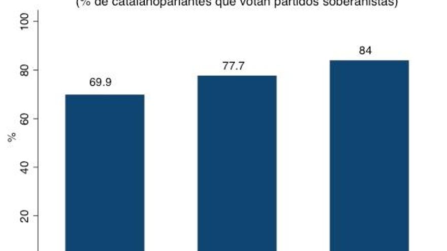 El gráfico deja patente que la influencia de la identidad nacional depende en parte del escenario que tienen los ciudadanos en la cabeza a la hora de votar. Por el momento, las fuerzas soberanistas han sido muy hábiles en estructurar la competición partidista en torno el debate sobre la independencia. Sin embargo, hay indicios de que el tablero político catalán está cambiando. La ruptura de CiU y la sombra de la “confluencia” están llevando la competición partidista hacia un terreno poco favorable para los intereses del bloque soberanista. Las elecciones “plebiscitarias” se acercan, pero la independencia está cada vez más lejos.