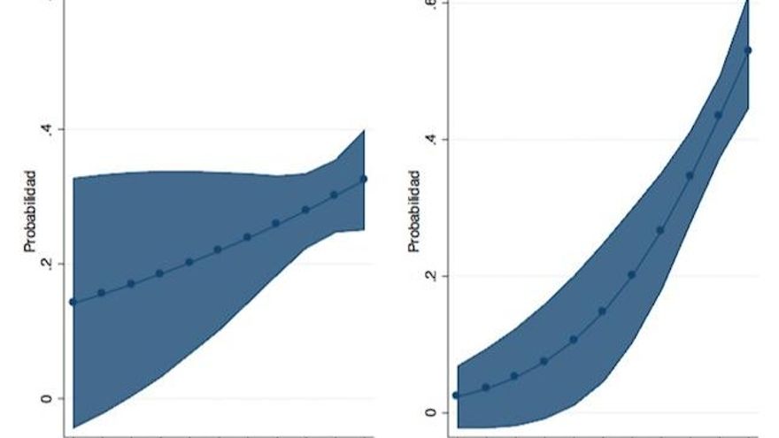 Nota: el gráfico muestra probablidad de votar a PDeCAT/JxCAT vs ERC estimadas a partir de un modelo logit en los que se incluyen como variables explicativas: ideología, sentimiento nacional, valoración líderes y socio-demograficos.