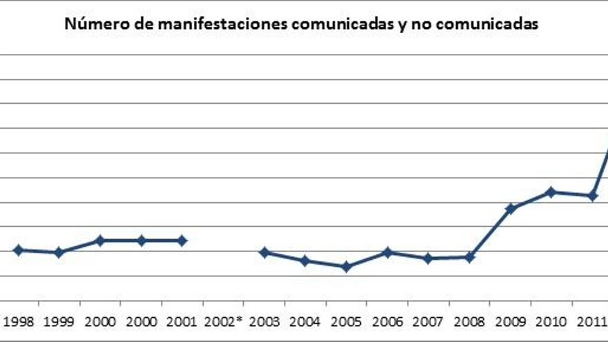 Durante el año 2012, el primero del gobierno del PP, se convocaron en España 44.233 manifestaciones, de acuerdo con el último Anuario Estadístico del Ministerio del Interior publicado hace unos meses. ¿Son muchas o pocas manifestaciones? Cada uno tendrá su opinión, pero el gráfico que adjunto es incontestable y merece comentario. Por un lado, a medida que golpea la crisis, aumentan el número de manifestaciones. Así, mientras en 2008 no se superan las 10.000 protestas, los tres últimos años del gobierno socialista de José Luis Rodríguez Zapatero se duplicaron llegando a las 20.000 anuales. Pero lo que realmente destaca es el desempeño del primer año de gobierno conservador. El periodo de gobierno de Rajoy ha batido todos los récords: durante su primer año de mandato el número de manifestaciones y protestas estuvo por encima de 44.000, una marca considerable.