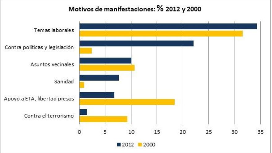 ¿Por qué se manifiestan los españoles? En 2012 los motivos fueron muchos, pero en un 34 % de las ocasiones fueron por asuntos laborales, seguido de un 22 % contra medidas políticas y legislativas -básicamente, contra las decisiones del gobierno central y autonómico - , y un 10 % por motivos vecinales. ¿Han variado las razones por las que se manifiestan los españoles? Sí, como indica el gráfico, en 2000 solo un 2,4% de las protestas se referían a políticas y medidas legislativas; un 31 % de las manifestaciones fueron por asuntos laborales (la única coincidencia con 2012), seguidas de las de apoyo a ETA y los presos (18.4 %), y los temas vecinales (10,7 %). La comparación con el año 2000 es adecuada por ser el primero de mayoría absoluta de José María Aznar. En ese año hubo 12.298 manifestaciones, de acuerdo con los datos del anuario del Ministerio para ese año, es decir, un poco más de una por cada cuatro manifestaciones habidas en 2012.