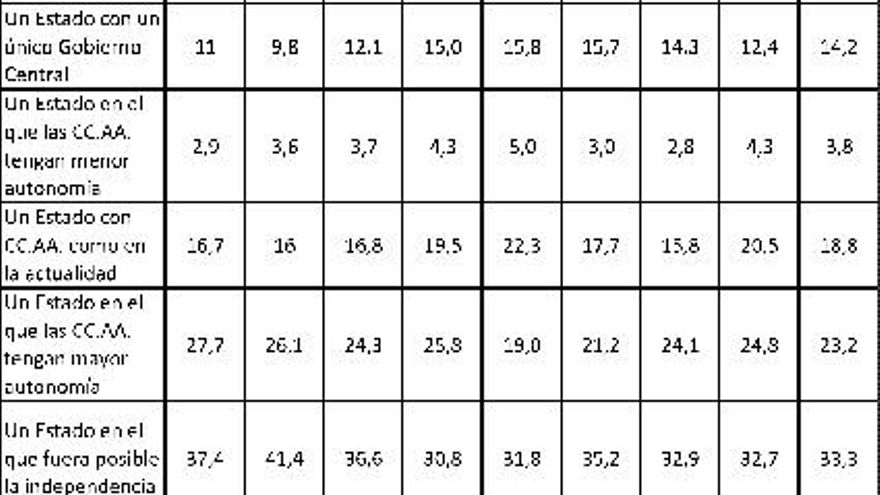 El CIS, en sus encuestas habituales, con la excepción notada, no pregunta de forma directa por la preferencia independentista no restringida, sino con algunos circunloquios: “mayor autonomía” en lugar de “federalismo”, y “posibilidad de independencia” en lugar de “independencia”. Llamémoslo preferencia por la organización territorial. Por medio del barómetro autonómico sabemos que solo una parte de quienes prefieren “un estado donde fuera posible la independencia” (un 37,4 % de los catalanes en septiembre-octubre de 2012) se declaran independentistas (un 33,7 % en esa misma encuesta). La ventaja de esta alambicada formulación es que se repite a menudo, en casi todos los barómetros mensuales (quién sabe por qué, este año ha faltado en junio), por lo que puede mirarse su evolución.