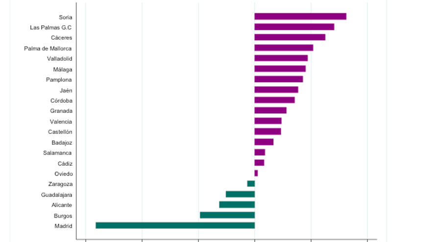 El gráfico muestra el saldo a favor (positivo) o en contra (negativo) de Podemos respecto a las candidaturas ciudadanas (en puntos porcentuales). Solo en 5 de las 21 capitales de provincia en las que Podemos apoyaba a candidaturas ciudadanas municipales, éstas lo hicieron mejor que Podemos (en la misma ciudad) por su propia cuenta. Estas son Madrid, Burgos, Alicante, Guadalajara y Zaragoza.