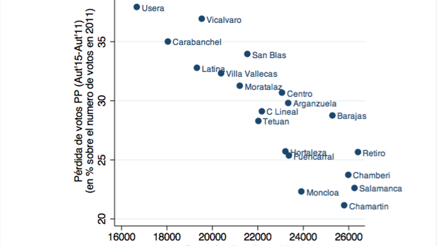Un ejemplo de esto es el PP en Madrid. El gráfico muestra el porcentaje de votos perdidos en cada distrito por el PP en las elecciones autonómicas respecto a las de 2011, y lo correlaciona con el nivel de renta familiar media en ese distrito (aunque es cierto que Cifuentes ganó a Aguirre en la capital, las diferencias en porcentaje de voto entre las dos listas son mínimas).