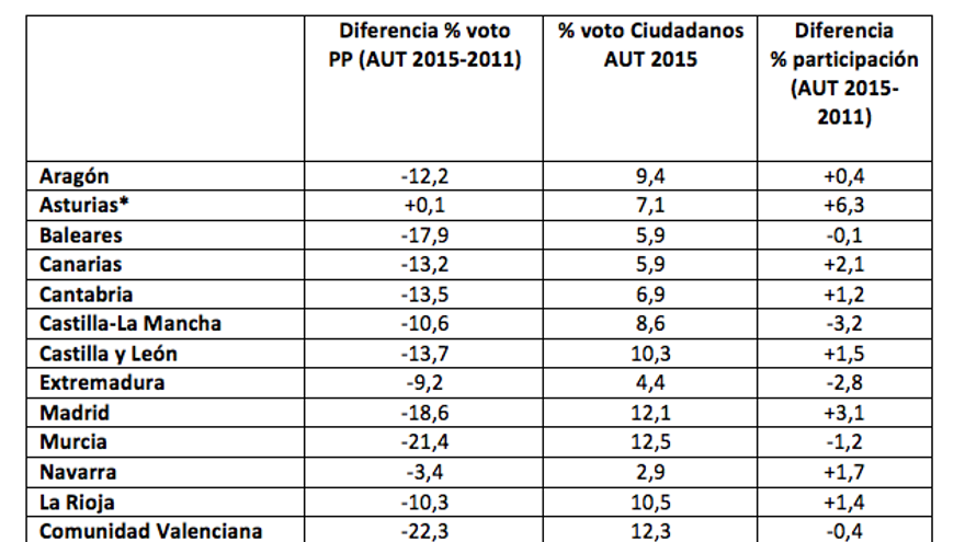 Una de las novedades de estas elecciones es que emerge con representación en casi todo el país un partido que compite por el electorado de centro derecha con el PP. Así, por ejemplo, en las elecciones autonómicas donde mayor porcentaje de votos ha logrado la formación liderada por Albert Rivera es en las Comunidades que han sido tradicionales graneros de votos del PP: Comunidad Valenciana, Región de Murcia, la Comunidad de Madrid, La Rioja y Castilla y León (ver cuadro 1). Una parte del electorado desencantado del PP se ha podido abstener, pero los ligeros descensos en la participación registrada en algunos de los bastiones históricos del PP apuntan a que una parte de los votantes del PP han optado por Ciudadanos.