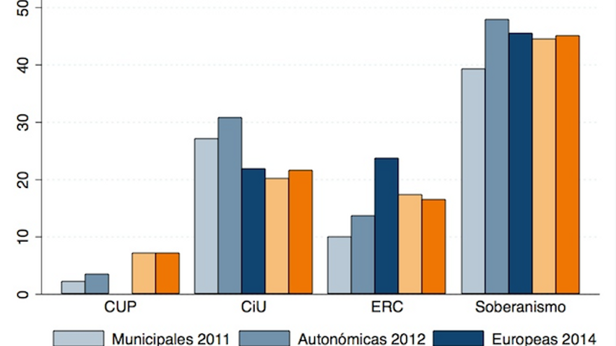Lo ocurrido en Barcelona no puede extrapolarse al resto de Cataluña. La suma de las fuerzas soberanistas a nivel de toda Cataluña se ha mantenido inalterada en torno al 45% (vean el gráfico). Así el 24M no parece añadir nada nuevo: el apoyo a los partidos soberanistas no se aleja mucho de los alcanzados en procesos electorales anteriores y en lo que auguran las encuestas en unas eventuales elecciones autonómicas. Aún siendo muy conscientes de que las elecciones locales no son totalmente equiparables a unos comicios autonómicos, la fotografía que nos deja el 24M no parece mostrarnos cambios inequívocos sobre el peso del soberanismo en Cataluña. En definitiva, la derrota del independentismo es más simbólica (la pérdida de la capital catalana) que numérica (votos).