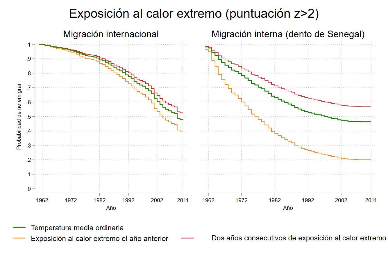 El gráfico revela que la exposición al calor extremo prácticamente no altera el riesgo de salidas de Senegal hacia el exterior. Sin embargo, cuando se ha estado expuesto a calor extremo en el año anterior, el riesgo de salir del lugar de origen con destino a otro departamento de Senegal aumenta de forma extraordinaria. Siendo esto cierto, cuando no se sale en el año posterior de exposición al calor, se entra en una trampa de inmovilidad y la perspectiva de salir decae por debajo de propia de un período climatológicamente ordinario.