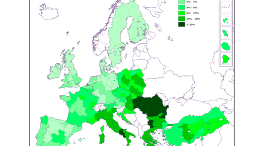 Gráfico 2. Experiencia con la corrupción en regiones europeas. Porcentaje de encuestados a quienes, durante el último año, se les ha solicitado pagar un soborno a cambio de obtener un servicio público.