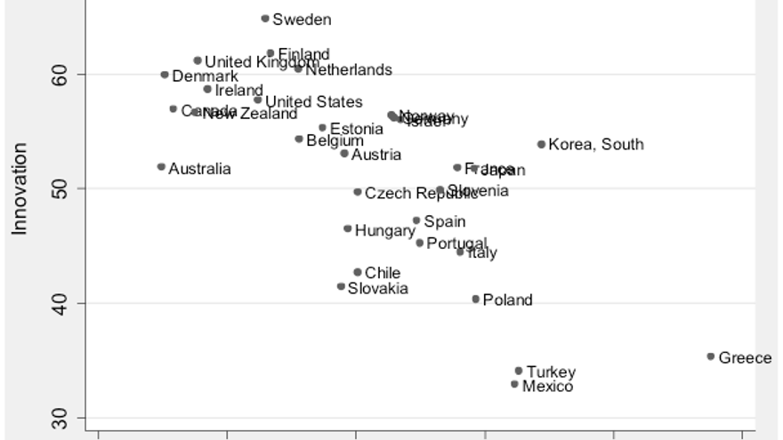 El gráfico 3 muestra los efectos devastadores que la regulación (excesiva, un poco de regulación es buena) tiene sobre la innovación económica (medida con un indicador estándar). Suiza regula sus mercados laborales, de productos y financieros relativamente poco e innova mucho. En el otro extremo está Grecia: la regulación de las actividades económicas es extenuante – significativamente por encima de Turquía, México o de economías altamente reguladas asiáticas como Corea – y la innovación económica muy baja.