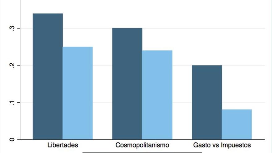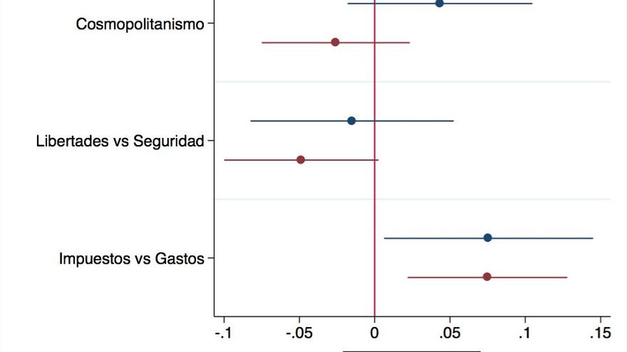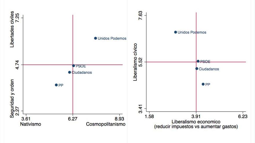 El gráfico de la izquierda muestra que existe una fuerte correlación a nivel agregado (aunque también a nivel individual) entre las posiciones de los electorados de cada partido en la dimensión cosmopolitanismo-nativismo (cómo el entrevistado valora la diversidad cultural que trae la inmigración) y en la dimensión libertades-seguridad (cuánto el entrevistado está dispuesto a sacrificar libertades individuales en pos de una mayor seguridad): Los electores del partido más “cosmopolitanista” (Unidos Podemos) son también los más defensores de las libertades individuales, y los más “nativistas” (los del Partido Popular) son los más defensores de la seguridad, con los dos restantes partidos en posiciones intermedias en ese eje.