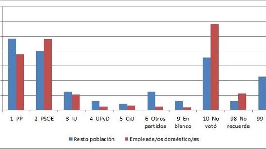 Desde el punto de vista de la ideología, si bien los empleados domésticos eligen a la izquierda con más probabilidad que el resto –no es sorpresa- lo que destaca es una mayor alienación política: votan mucho menos que los demás. Es algo que sucede, en general, con los trabajadores de poca cualificación, algo que es malo que suceda.