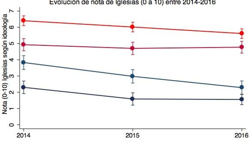 Sin embargo, para efectuar un cálculo de los potenciales efectos electorales que puede tener la crisis de popularidad del líder de Podemos debemos refinar el análisis y centrarnos en la evolución por grupos ideológicos. Si lo hacemos podemos observar cómo la caída de las valoraciones de Iglesias entre 2014 y 2016 se concentran especialmente en un grupo muy particular: los votantes de centro. Durante este período la valoración de Iglesias ha caído un 40% entre este colectivo, mientras que entre los votantes de izquierda la caída ha sido del 18% y entre los de centro-izquierda no se han producido cambios apreciables.