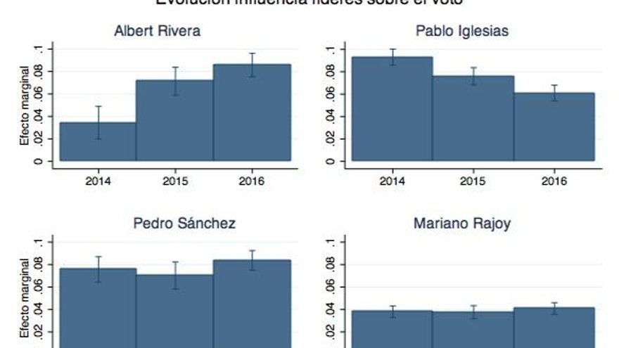 Nota metodológica: los datos son de GESOP para El Periódico de diciembre 2014, abril 2015 y marzo 2016. El efecto de los líderes se ha estimado con modelos de regresión en los q se incluye la valoración del líder de partido (0 a 10) y controles de edad, sexo, educación, ocupación e ideología.