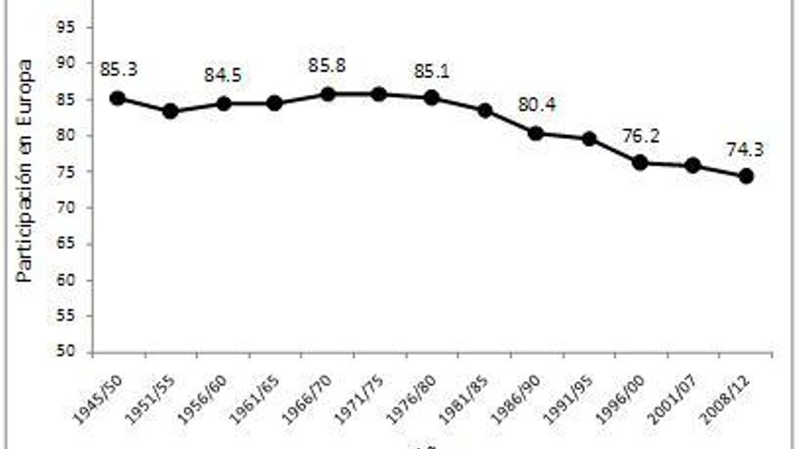 En su artículo, Carlos Elordi sugería que la abstención se había acentuado en los últimos tiempos en la mayor parte de democracias desarrolladas, probablemente como consecuencia de la crisis económica. Sin embargo, un análisis sistemático de las elecciones en Europa no parece confirmar tal extremo. Un repaso a la evolución de la participación en Europa a lo largo de las últimas cinco décadas da cuenta la escasa excepcionalidad de los tiempos actuales. El gráfico 1 muestra cómo la participación en Europa se mantiene relativamente estable en torno al 85% a lo largo del período 1945-1980. Es a partir de entonces cuando se inicia un progresivo descenso en la participación que llega hasta la actualidad. Dicho descenso, a pesar de ser muy moderado (de apenas 1,8 puntos por lustro), se mantiene relativamente constante en todo el período. Como consecuencia, la participación ha acabado cayendo en las últimas tres décadas alrededor de 11 puntos, situándose en torno al 75%.