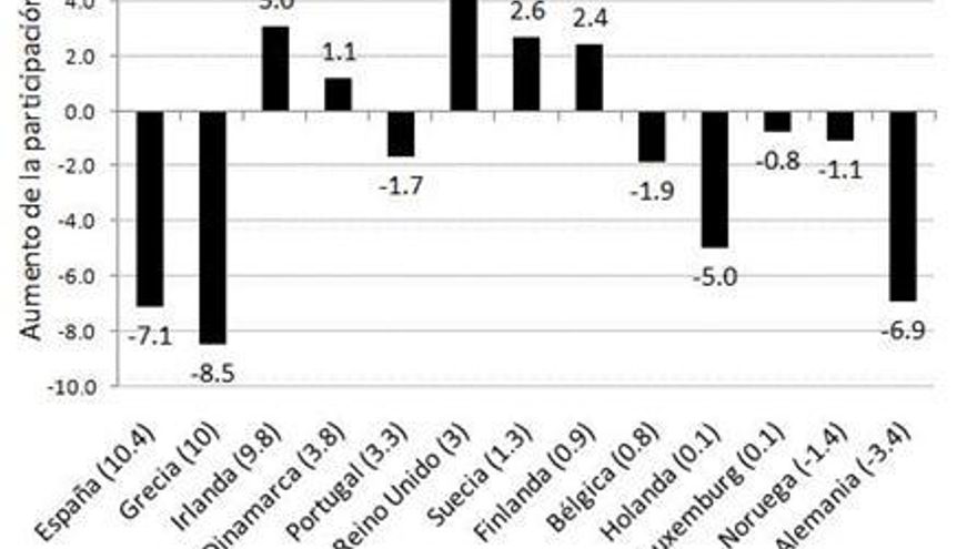 La escasa excepcionalidad en la caída de participación en los últimos años indica que el responsable de tal caída no se encuentra tanto en la actual crisis económica sino más bien en factores más estructurales que vienen de lejos, probablemente a cambios en la cultura política de las nuevas generaciones. Una manera sencilla de comprobar esta intuición es simplemente mirar la evolución de la participación electoral en los países que han tenido elecciones en los últimos tres años y confirmar si las caídas de participación se produjeron en aquellos países donde la crisis fue más severa. Esto es precisamente lo que mostramos en el siguiente gráfico: