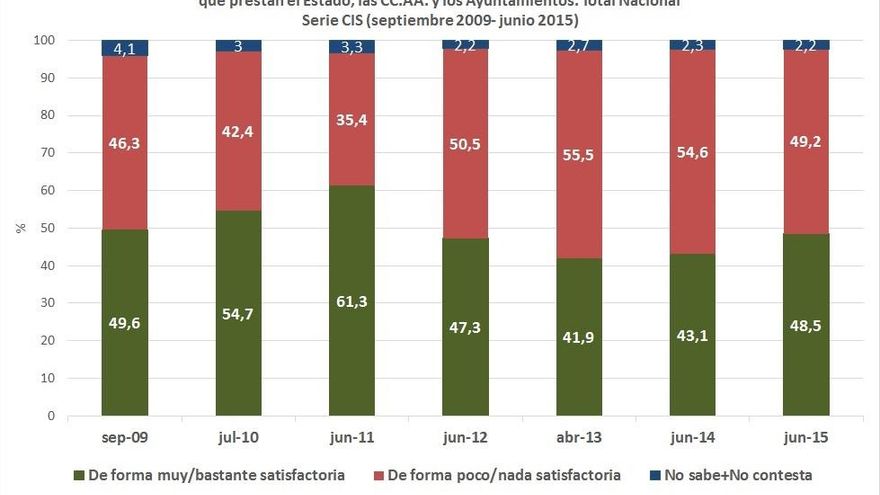 Lo primero que llama la atención al “bucear” en los datos del CIS es que nos encontramos con una opinión pública polarizada cuando se formula la pregunta de cómo funcionan los servicios públicos que prestan el Estado, las CC.AA. y los Ayuntamientos en su conjunto. De este modo, y de acuerdo con los últimos datos disponibles referidos a junio de 2015, mientras un 49,2% de los ciudadanos considera que dichos servicios funcionan de forma poco o nada satisfactoria, otro 48,5% cree que lo hacen de forma satisfactoria. Entre septiembre de 2009 y junio de 2011, en plena crisis económica, lejos de verse resentida la valoración que tenían los ciudadanos sobre el funcionamiento de los servicios públicos, ésta mejoró (gráfico 1). No fue hasta la segunda mitad de 2012 cuando se produjo un punto de inflexión negativo y comenzó a ser mayoritaria la opinión de que los servicios públicos funcionaban de forma insatisfactoria; opinión que siguió siendo mayoritaria hasta junio de 2014 y que mejoró en 2015 (quizás influida por una valoración ciudadana menos negativa de la situación económica y por el mensaje del gobierno del PP sobre la recuperación económica con la aplicación de rebajas fiscales incluida).