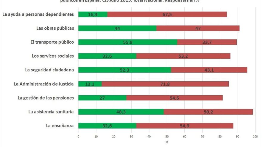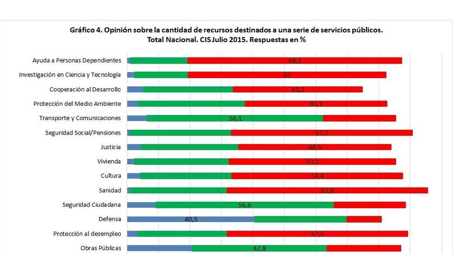 En consonancia con el elevado grado de insatisfacción que muestran los ciudadanos con el funcionamiento de muchos servicios públicos, no es de extrañar que exista una amplia percepción de falta de dotación presupuestaria de los mismos. En julio de 2015, siguiendo los datos del CIS, de un listado en el que se incluían un total de 15 servicios públicos, los ciudadanos de forma mayoritaria solo señalaron dos de ellos (los transportes y la seguridad ciudadana) como aquéllos que están financiados adecuadamente. También es predominante (aunque no mayoritaria) la opinión de que las obras públicas cuentan con una dotación presupuestaria adecuada. Por el contrario, la mayoría de los ciudadanos considera insuficientes los recursos que las Administraciones Públicas destinan a financiar la ayuda a personas dependientes, la sanidad, la investigación en ciencia y tecnología, la enseñanza, las pensiones, la protección al desempleo, la cultura y la vivienda (gráfico 4). En la misma línea, la opinión predominante (sin ser mayoritaria) es que la justicia, la protección al medio ambiente y la cooperación al desarrollado cuentan con muy pocos recursos. En el extremo opuesto, estaría el gasto público en defensa que predominantemente es considerado excesivo por la ciudadanía.