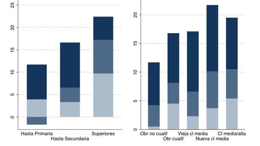 Primero, como mostraba el gráfico anterior son los grupos sociales más acomodados los que más aumentan su propensión a no expresar una preferencia de voto. El porcentaje de BAIs es en torno a 20 puntos porcentuales superior en 2013 que en 2009 entre los encuestados con estudios superiores y pertenecientes a clases sociales medias y altas, pero es “sólo” 10 puntos superior entre aquellos con estudios de primaria o inferiores y para los obreros sin cualificación.