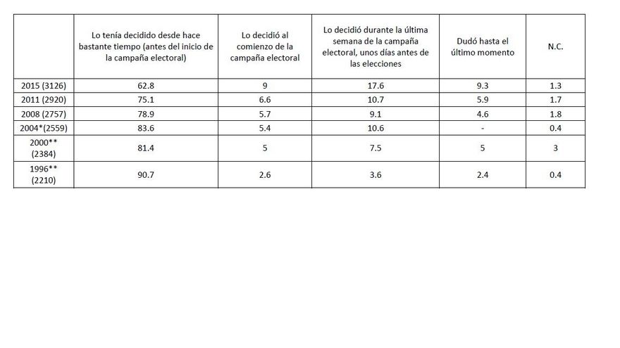 Este nivel de indecisión también podría utilizarse como indicador de la importancia de las campañas electorales. De hecho, en los estudios académicos sobre campañas electorales, el aumento de la indecisión es un factor que explica la importancia de estas. Si se piensa, es normal: a medida que menos gente tiene su voto decidido antes de los 15 días de campaña (mas los otros 15 de precampaña), más atención deberían prestar los ciudadanos a lo que sucede durante estas. España no es una excepción y los datos que se muestran en la tabla no son exclusivos de nuestro país.