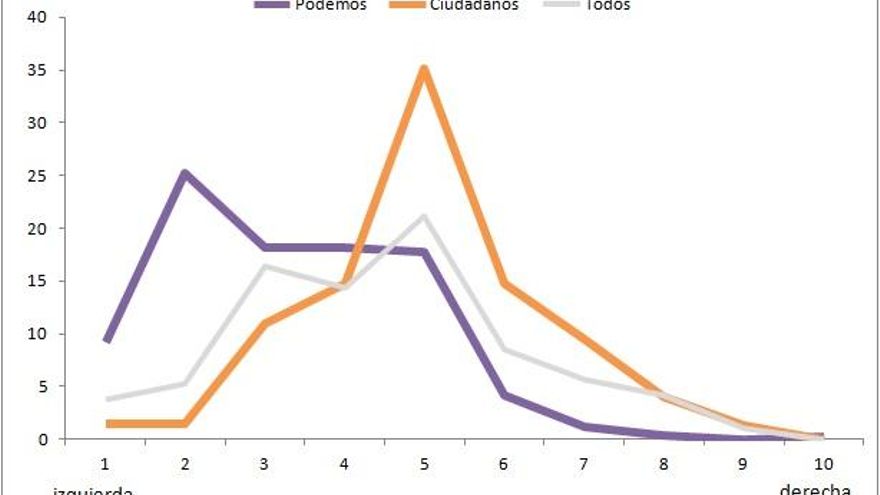 Ahora bien, antes de explicar por qué creo que el ascenso de Ciudadanos puede suponer un problema –o cuatro dardos– hacia la tan exitosa estrategia discursiva de Podemos, vale la pena responder a dos objeciones inmediatas que podrían poner en tela de juicio la mera pregunta que os planteo. La primera es que Podemos y Ciudadanos no compiten entre sí. Es decir, que son partidos que apelan a dos electorados diferentes. A mi juicio, y a la luz de los datos, este razonamiento difícilmente puede ser acertado. Puesto que ninguna de estas formaciones se presenta deliberadamente con un marcado carácter de izquierdas o de derechas, ambos tendrán que dirigirse a los votantes de centro y centro-izquierda para maximizar el número de votos.