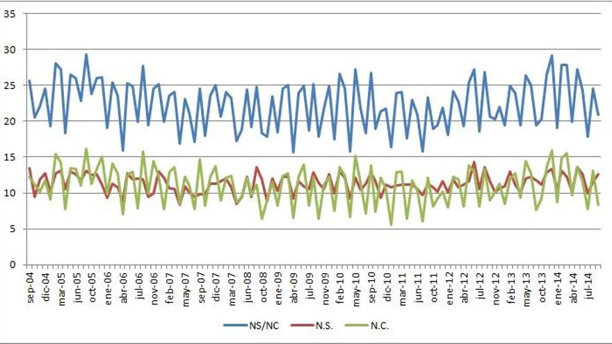 Como veremos, y estoy seguro que tampoco se le escapará ya al lector, esto es parte de una estrategia más elaborada de superación de antiguos referentes y significados políticos. Pero volvamos por un momento a nuestras viejas coordenadas. ¿Dónde está Podemos? Las encuestas nos dicen que los españoles ubican a Podemos claramente en la izquierda de la escala ideológica. Concretamente en el 2.43 según el barómetro del CIS de noviembre 2014.[1] No obstante, Podemos recoge votos desde la izquierda, el centro-izquierda, el centro y algunos (cada vez más) del centro-derecha. ¿Cómo es esto posible? Ellos mismo argumentan que el eje izquierda-derecha ya no es el apropiado para disputar la política en nuestro país, fundamentalmente a partir del movimiento de las placas tectónicas iniciado en torno al 15-M. Pero, en contra de lo que parece describir –o querer escribir – la narrativa de Podemos, los estudios demoscópicos del CIS sobre la evolución de la distribución ideológica de los españoles no muestran indicios claros acerca de la pérdida de importancia de la dimensión izquierda-derecha. El gráfico que aparece aquí abajo muestra la evolución de los “No sabe” y “No contesta” cuando se le pregunta a los encuestados por su ubicación desde el 2004 hasta la actualidad. No se aprecian cambios significativos. Aun no siendo suficiente dicho ejercicio como refutación[2], cabe poner un interrogante sobre el discurso de la superación de la competición política en torno a la ideología imaginando que, quizá, responda a cuestiones de oferta (estrategia programática del Podemos) y no a cuestiones de demanda (preferencias de los ciudadanos).
