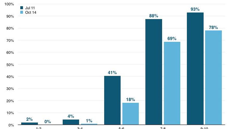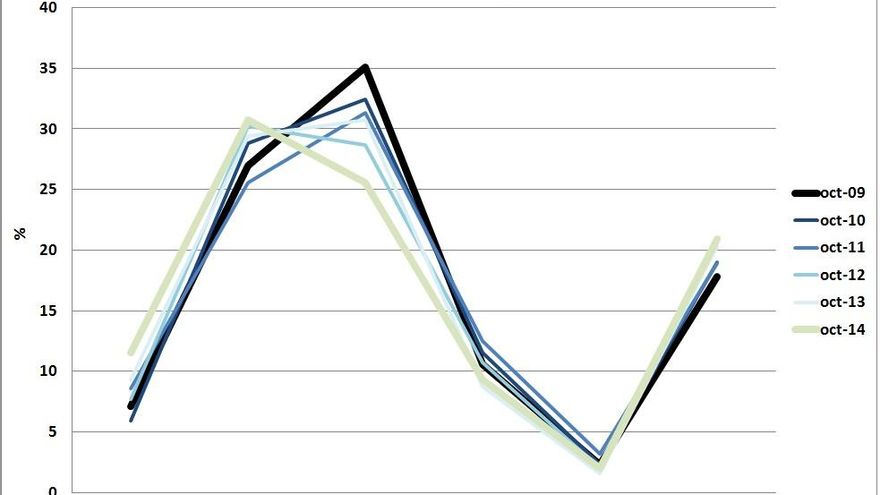 Es cierto que -como ya se ha señalado varias veces- la posición ideológica de los españoles carga un poco hacia la izquierda, pero no parece menos cierto que la evolución de la distribución ideológica de nuestra sociedad vaya insinuando una gradual y (está por verse si pronunciada) inclinación en esa misma dirección en los últimos años. También es cierto que si miramos la distribución sin agrupar por categorías ideológicas, la posición 5 de la escala (la que la gente normalmente identifica como “centro”) sigue siendo la más elegida entre los encuestados: en octubre de 2014 el 18%, pero en julio de 2011 alrededor del 23%. Cinco puntos porcentuales menos no pueden significar algo anecdótico.