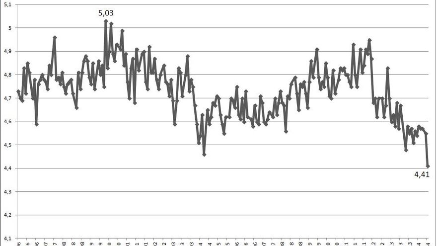 La media también refleja estos cambios. La diferencia entre octubre de 2009 y 2014 indica un movimiento de 0.38 puntos hacia la izquierda (de 4.79 a 4.41). De hecho, la media de octubre de 2014 es la que está más a la izquierda desde enero de 1996 (el dato más lejano que podemos comprobar pasando de puntillas por la web del CIS). El gráfico 2 muestra dicha evolución. Si bien el movimiento desde 2009 no es poca cosa, mucho menos lo es la caída que se produce en torno a la llegada de Rajoy al poder en noviembre de 2011. La media pasa de 4.9 al actual 4.4. Medio punto.
