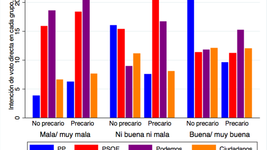 Podemos es el partido que tiene un electorado más “excluido laboralmente” de todos, por encima del PSOE y especialmente de Ciudadanos y del PP. Incluso cuando nos fijamos en individuos con la misma percepción subjetiva sobre cómo les va económicamente, los indicadores “objetivos” de la posición que el individuo ocupa en el mercado laboral influyen en la intención de voto a Podemos. Como muestra el gráfico 2, Podemos tiene sistemáticamente intenciones de voto más altas entre los que juzgan su situación económica como mala o muy mala. Pero independientemente de esta opinión, el voto a Podemos aumenta cuando se tiene una posición precaria en el mercado de trabajo (definida aquí como cumplir alguna de las dos condiciones usadas en el gráfico 1: estar en el desempleo o tener un contrato eventual).