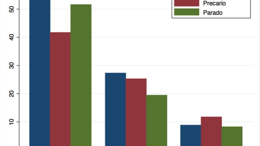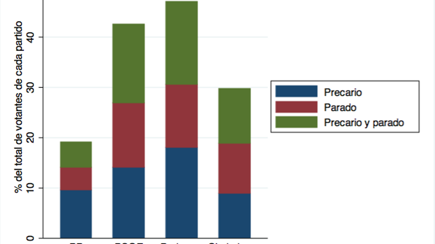 El gráfico 1 muestra la proporción de “excluidos laborales” entre los votantes de cada uno de los cuatro grandes partidos. En el gráfico se contabilizan los parados (por algún error, Marí-Klose ofrece cifras incorrectas sobre la diferencia entre intención de voto de parados a PSOE y Podemos en el barómetro del Abril del CIS), los “precarios” (encuestados que viven en hogares en el que la persona que aporta más ingresos no tiene un contrato fijo) y los “parados y precarios” (encuestados que además de vivir en uno de esos hogares, están actualmente en paro).