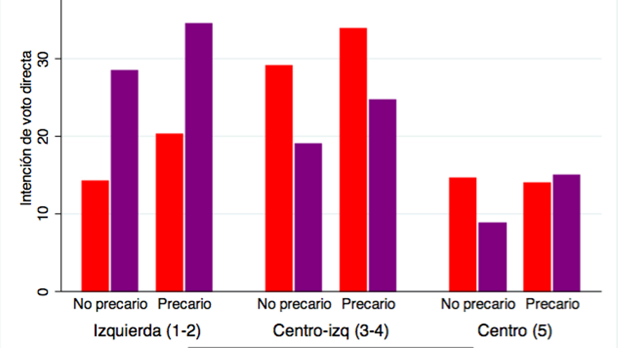 Gráfico 3. Intención de voto a Podemos y PSOE entre los votantes de izquierda y de centro y posición en el mercado laboral.