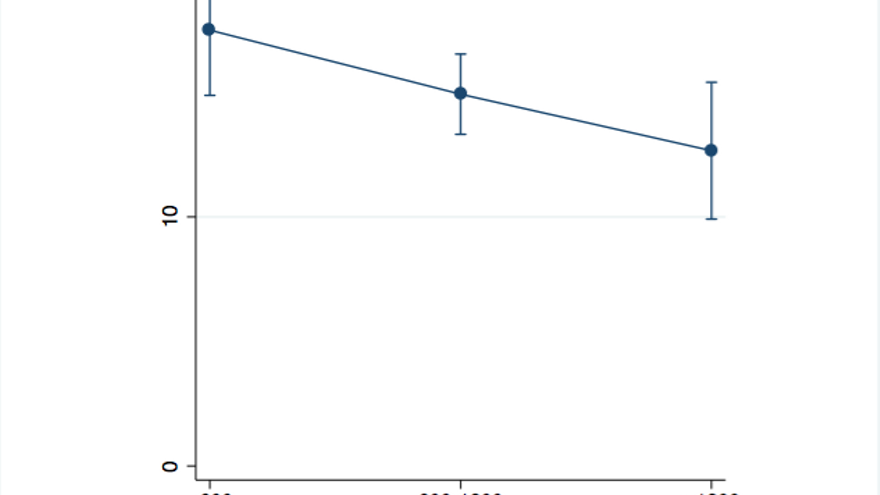 Una solución (muy imperfecta) es usar los ingresos individuales, en los que el error de medida es seguramente menor y este segundo problema de la composición del hogar no está presente. Además, la tasa de respuesta a esta pregunta en la encuesta es algo mayor. Si lo hacemos, en el barómetro de Abril estos ingresos están de hecho correlacionados negativamente con el voto a Podemos. Incluso después de descontar el efecto de la edad, el género, el nivel educativo y la comunidad autónoma de residencia, los individuos que declaran tener ingresos personales más bajos tienden a tener una probabilidad significativamente más alta de votar a Podemos, como muestra el gráfico 4.