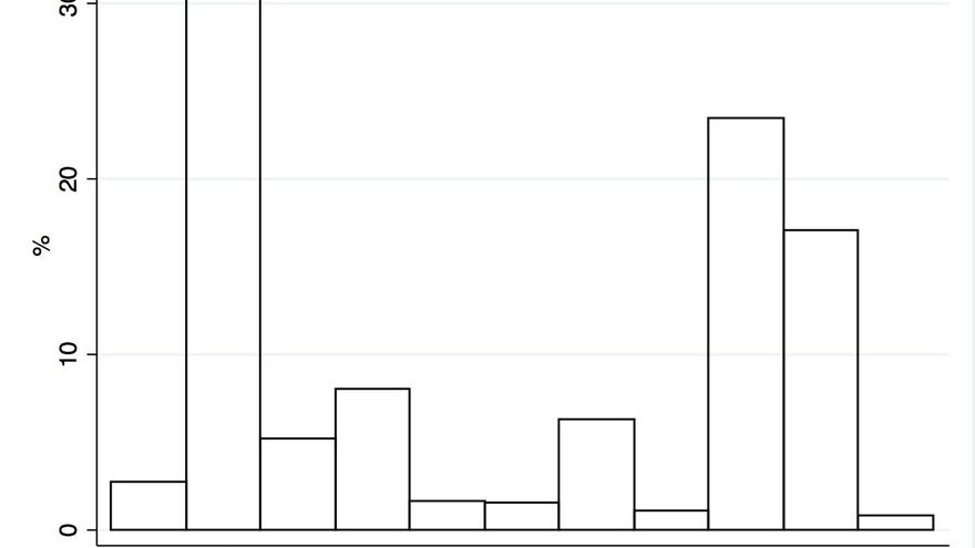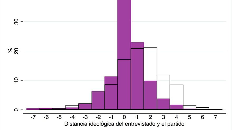 El gráfico 3 muestra la distancia entre la ubicación ideológica del encuestado y la que éste adjudica a la formación liderada por Iglesias. Los valores positivos indican que el encuestado posiciona a Podemos a la izquierda de su propia ideología, los valores en el 0 que la posición del individuo y la que éste le da al partido coinciden, y los valores negativos que el encuestado posiciona a Podemos en posiciones a la derecha de su propia ideología. Un 18% de “los que faltan” entienden que Podemos está a su derecha; un 17% de ellos coincide en el mismo punto de la escala (a pesar de no haberles votado); y un 64% cree que el partido morado está a su izquierda. Éste último dato es aun algo más peliagudo si se mira con detalle, pues en torno al 23% creen que Podemos está a 3 o más puntos de distancia mirando a su izquierda.
