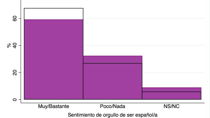 Adentrémonos ahora en la cuestión nacional. Una de las batallas que pretender lidiar Podemos es alrededor del concepto de “patria”. En varias ocasiones hemos escuchado a sus dirigentes su intención de romper con el monopolio de la derecha respecto a la bandera, a la nación, a la patria. Su estrategia, hasta el momento, sólo se ha quedado en intentar unir el amor a nuestro país con el cuidado de los más desfavorecidos, la defensa de los servicios públicos, o en contra de los privilegiados. ¿Cuán patrióticos se sienten LQF en relación a los votantes de UP+Confluencias? El gráfico 5 responde a esta pregunta con la concepción de patria tradicional (sentimiento de orgullo de ser español/a), y aunque reafirma la intuición más básica (LQF se sientes más orgullos) las diferencias no son muy importantes. Un 67% de LQF se sienten muy o bastante orgullosos de ser españoles, pero el 59% de los que han cogido una papeleta morada el pasado junio también. ¿Esto podría indicar que la cara más españolista (pero plurinacional) de Podemos podría funcionar como fuente de atracción para LQF?