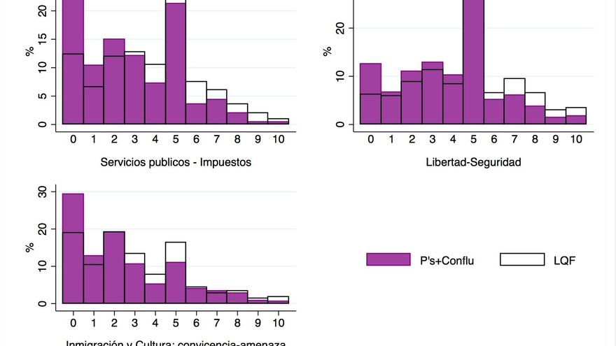 En términos generales el grado de solapamiento de las preferencias entre ambos grupos parece elevado. Los votantes de UP+Confluencias son muy parecidos a LQF. Las diferencias aparecen tímidamente y son pocas. En relación al binomio servicio-impuestos, por ejemplo, mientras que solo un 10% del votante morado manifiesta que es más proclive a una disminución de impuestos aunque esto signifique una reducción en la prestación de servicios públicos y prestaciones sociales (los que se ubican en el segmento 6-10 de la escala), éste porcentaje es 10 puntos mayor en el caso de LQF.