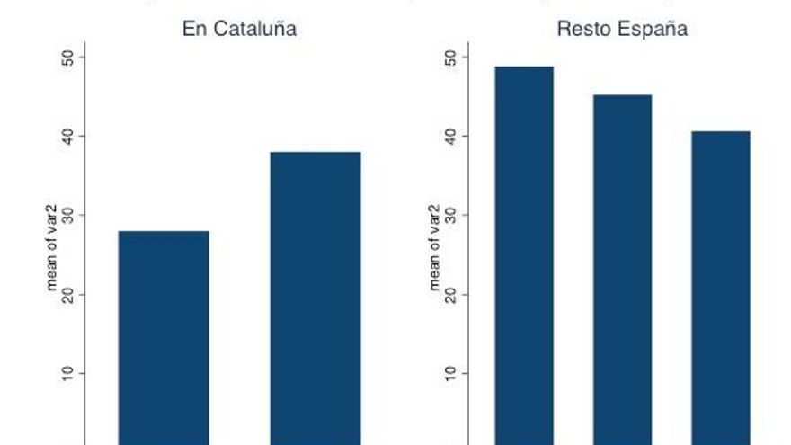 Pero quizás el elemento que más debería preocupar a Podemos con respecto a su posición sobre la cuestión nacional está recogido en el gráfico 1. El gráfico muestra el porcentaje de votantes que, aún asegurando tener intención de votar a Podemos, admiten que su probabilidad de hacerlo no es alta. En otras palabras, se trata del volumen de votantes poco convencidos, que más fácilmente podrían cambiar el sentido de su voto en función de la coyuntura.