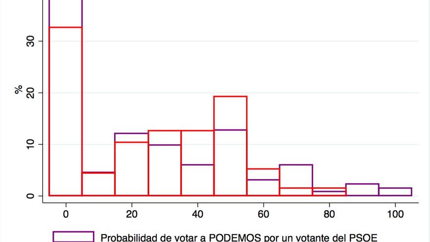 Con estos mimbres comencemos a explorar los datos. El gráfico 1 muestra la distribución de la probabilidad de voto declarada por los votantes de Podemos y PSOE a sus rivales políticos. En color morado pintamos la probabilidad de votar a Podemos por un votante del PSOE y en color rojo la probabilidad de votar al PSOE por un votante del Podemos. Vemos que cerca del 40% de los votantes socialistas nunca votarían a podemos (barra morada en el valor 0), mientras que un tercio de los votantes de Podemos (33%) nunca lo haría por el PSOE (barra roja en el valor 0). En lo que aquí nos ocupa, vemos que agregando las barras que van del 40% en adelante, cerca de un tercio de los votantes socialista (32%) estarían dispuestos a dar su voto a la formación morada, mientras que un 40% de los votantes de Podemos estaría dispuesto a hacerlo por los socialistas.