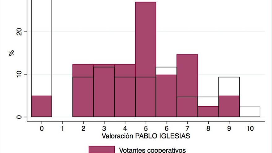 A diferencia de los análisis anteriores, ahora las diferencias entre votantes cooperativos (barras pintadas) y NO cooperativos (barras sin pintar) emergen con mayor claridad. Un 58% de los votantes menos proclives a cooperar desaprueban la actuación política de Pablo Iglesias. Un 28% lo hacen con un 0. Seguramente se trate del grueso de los votantes socialistas. Lo aprueban un 42%, un 9% es con un aprobado justo (5), y en los valores más positivos (8, 9 y 10) destacan, seguramente, los votantes morados muy alejados de la cooperación con el PSOE. Entre el votante con perfil pro-cooperación vemos que el 59% aprueba la actuación de Iglesias (valores igual o mayores a 5, el 25% le dan el aprobado justo), y el 41% lo desaprueban. La valoración media del líder de Podemos es de 3.8 entre los votantes NO cooperativos, mientras de 4.7 entre los cooperativos, y esta diferencia sí es estadísticamente significativa.