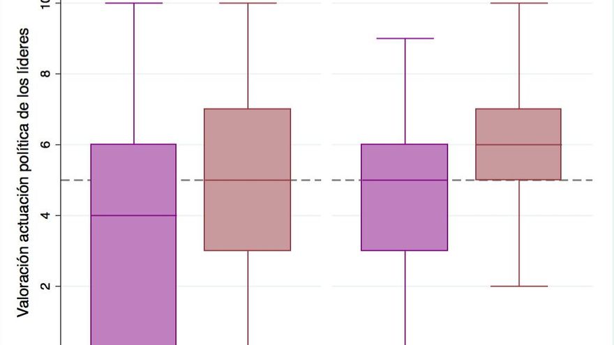 La valoración de la actuación política del líder del PSOE, Pedro Sánchez, también emerge como potencial explicación de las diferencias entre los dos tipos de votantes de nuestra comparación. El 40% de los menos proclives a cooperar desaprueban a Pedro Sánchez. El 60% restante la aprueba. En media, Sánchez, consigue el aprobado entre estos votantes menos probables a cooperar (un 5), pero la diferencia con la media de los más proclives a cooperar es estadísticamente significativa (un 6). Estas diferencias también se pueden ver en la comparación presentada en el gráfico de cajas (gráfico 5).